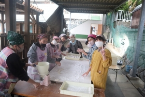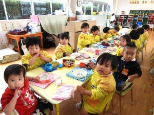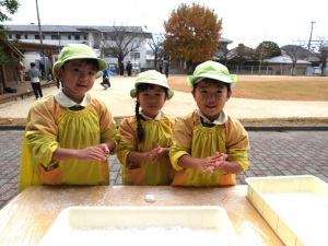 園で餅つきを行いました。「ペッタン!ペッタン!」と重い杵を持ち、一生懸命にお餅をつきました。つきたてのお餅の香りや感触を楽しみ、きな粉をまぶしたきな粉餅をおいしく食べました。日本の伝統行事に親しむことができた一日となりました。